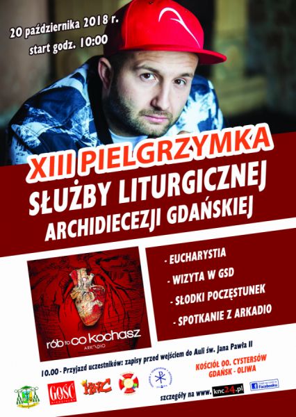 W tym roku będzie nam towarzyszyć hasło: "RÓB TO, CO KOCHASZ”.Pielgrzymkęrozpoczniemy spotkaniem w Auli św. Jana Pawła II. Uczestnicy zostaną podzieleni na dwie grupy – starszą i młodszą. Dzięki temu treści spotkania ewangelizacyjno-formacyjnego będą bardziej dostosowane do wieku uczestników. Gościem specjalnymbędzie ARKADIO (Arkadiusz Zbozień) - raper, freestylowiec, mówca. Rocznik '90, urodzony w Nowym Sączu. Autor czterech płyt, audiobooka i książki oraz pomysłodawca ogólnopolskiej akcji „Rób to co kochasz”. Ten czas będzie wypełniony świadectwem, muzyką i multimediami. W między czasie pozostali uczestnicy będą mieli czas na zwiedzenie GSD oraz spotkanie w grupach.