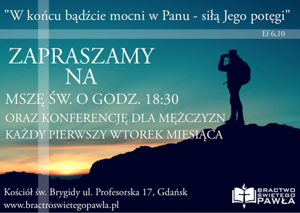 Duszpasterstwo mężczyzn Bractwo Św. Pawła działające w parafii Św. Brygidy w Gdańsku zaprasza mężczyzn naszej Archidiecezji na Mszę Świętą dla mężczyzn. Eucharystia i spotkania będą odbywać się cyklicznie, w każdy, pierwszy wtorek miesiąca o godz. 18:30.