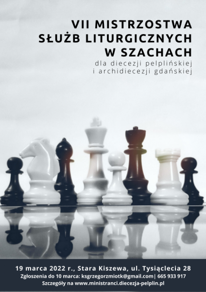 Diecezjalne Duszpasterstwo Służb Liturgicznych Diecezji Pelplińskiej oraz Archidiecezji Gdańskiej, Diecezjalne Duszpasterstwo Sportowców i Parafia św. Marcina w Starej Kiszewie organizują VII Mistrzostwa Służb Liturgicznych w szachach, które odbędą się 19. marca 2022 roku w Starej Kiszewie (ul. Tysiąclecia 28 – plebania).